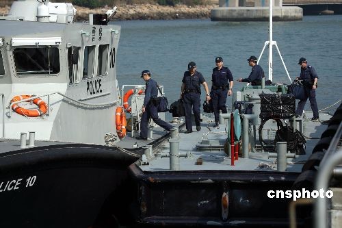 三月二十四日﹐参加香港海域严重撞船意外的海警队员整装待发。二十二日晚﹐香港国际机场以东的大小磨刀洲海面发生严重撞船意外,一艘乌克兰注册的油田补给船与一艘内地货船相撞﹐补给船迅速翻沉﹐七名船员获救﹐十八名乌克兰船员随船一并沉落在三十七米海底﹐至今下落不明。中新社发 武仲林 摄