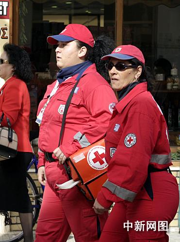 希腊当地时间3月24日,北京二00八年奥运会圣火采集仪式在古奥林匹亚竞技场举行。仪式开始前,身着醒目红色工作服的救护人员准备入场。 中新社记者 王欢