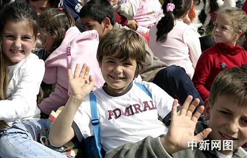 希腊当地时间3月24日,北京二00八年奥运会圣火采集仪式在古奥林匹亚竞技场举行。希腊小观众坐在草坪上观看采集仪式。 中新社记者 王欢