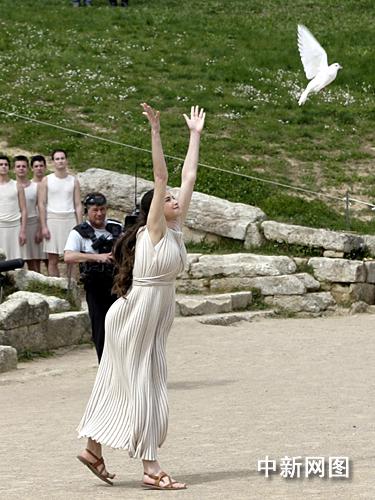 希腊当地时间3月24日,北京二00八年奥运会圣火采集仪式在古奥林匹亚竞技场举行,最高女祭司顺利采集到火种。一名女祭司手捧白鸽走到众人之前,面向古竞技场放飞白鸽。 中新社记者 王欢