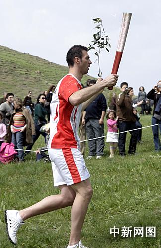 希腊当地时间3月24日,北京二00八年奥运会圣火采集仪式在古奥林匹亚竞技场举行,随后火炬希腊传递开始。第一棒火炬手亚历山大右手擎火炬,左手举橄榄枝跑向顾拜旦墓。 中新社记者 王欢