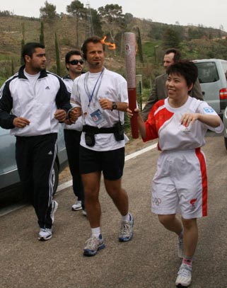 北京奥运圣火传递第第三棒运动员邓亚萍。中希时报 汪鹏摄
