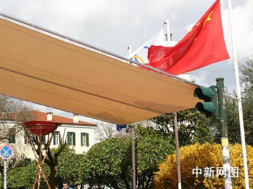 3月25日,北京2008年奥运圣火希腊传递第二天,庆典仪式在终点约阿尼纳举行。存放北京奥运圣火的圣火盆架在国旗下。中新社记者 王欢