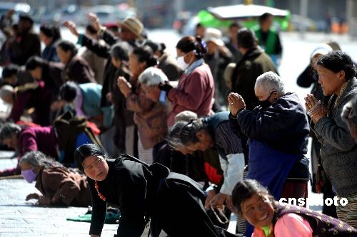 众多信众在布达拉宫广场上叩首。中新社发 廖攀 摄