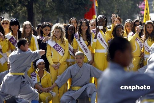 国际旅游小姐少林寺观赏武僧表演。中新社发 慎重 摄