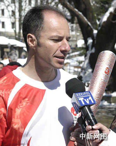 3月26日,北京奥运会圣火希腊境内传递第三日,抵达冰雪覆盖的山城迈措翁。火炬手、希腊越野滑雪运动员尼克考斯期待自己能参加2010年温哥华冬奥会。中新社记者 王欢