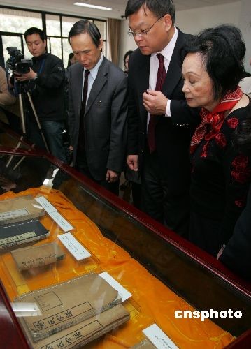 宋子文长女冯宋琼颐(右)在其亲属的陪同下参观了上海图书馆,并对目前馆藏的众多名人家谱产生了浓厚的兴趣。中新社发 汤彦俊 摄