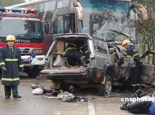 三月二十七日六点四十分,广西柳州市鹿寨县寨沙镇发生特大交通事故,一辆从贵州开往广东的小车与一辆大客车迎面相撞,造成小车上包括司机在内的六男四女共十人当场死亡,另外两男子受重伤。中新社发 覃俊锋 摄