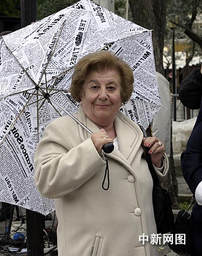 3月27日,北京奥运圣火希腊境内传递第四天,打着漂亮雨伞的老妇人在韦里亚等待观看火炬起跑仪式。 中新社记者 王欢