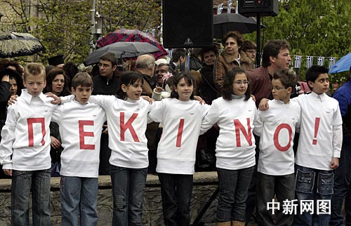 3月27日,北京奥运圣火希腊境内传递第四天,山城纳乌萨迎来第一个庆典仪式。十几个孩子的T恤上印有希腊字母,他们组成了“好运北京”。中新社记者:王欢