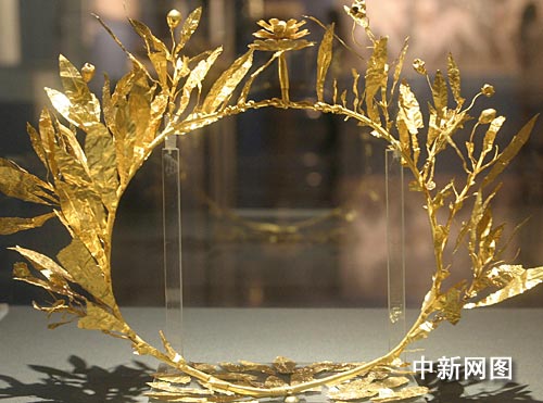 3月27日,北京奥运圣火希腊境内传递第四天途径派拉古城,博物馆展出了部分发掘的历史文物。图为国王菲利普二世的金色橄榄枝王冠。中新社记者:王欢