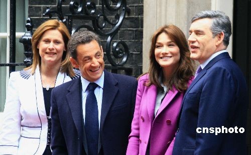 当地时间3月27日中午,正在英国进行国事访问的法国总统萨科奇携新婚妻子布鲁尼,与英国首相布朗在唐宁街10号会见。中新社发 李鹏 摄