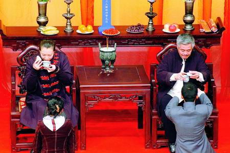 我觉得一个团队要有点规矩,师徒之间要有一种传统。我是一个民间艺人,我经营二人转从没有到有,从不景气到想看买不到票,这个过程给我带来很大的收获。那些学生,之前我都已经一批一批收完了,我想在那天给他们一个证书、给他们一个忠告,让他们知道赵门的规矩,怎么做人。那天收了35个,只有四五个是新收的学生,只是有一个排序,我给他们发了一个聘书,发了一个我给他们写的字画。