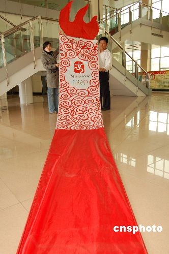 3月30日下午,潍坊风筝艺人王兆瑞特意扎制的奥运火炬风筝进行试飞。王兆瑞,今年54岁,是潍坊中心血站的一名职工,六岁开始扎制风筝,多次在国际风筝会上获奖。当奥运会即将到来和第二十五届国际风筝会到来之际,特意扎制了奥运火炬风筝。这只奥运火炬风筝属软板类风筝,高6.5米,宽1.1米,主体框架用玻璃钢杆制成,以格子绸为布料,按照祥云火炬的实际比例扩大手绘的。
