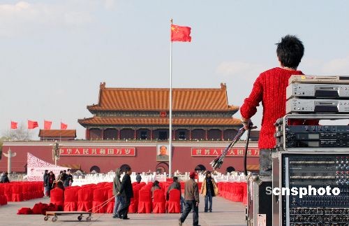 3月30日,工作人员在天安门广场做搭建“奥运圣火台”的收尾工作、布置场地,迎接即将到来的2008年北京奥运会圣火火种欢迎仪式。