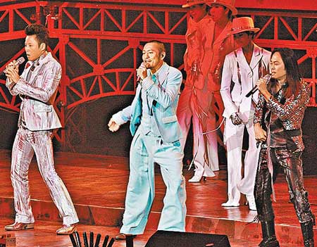 草蜢三位成员(左起)蔡一杰、苏志威及蔡一智载歌载舞演绎张国荣歌曲。