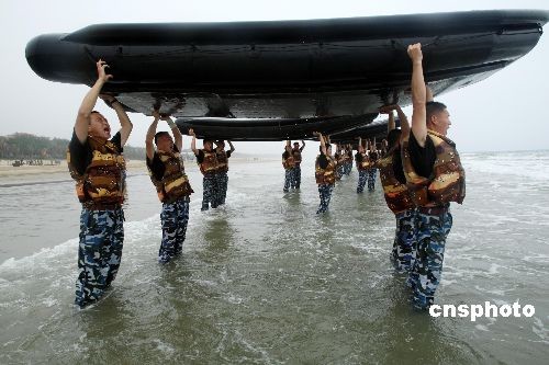 图为陆战队员在组织扛舟训练。中新社发 李唐 摄