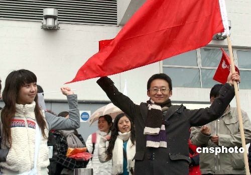 图为中国留学生在温布利体育场外为奥运圣火助威。 沈晨 摄