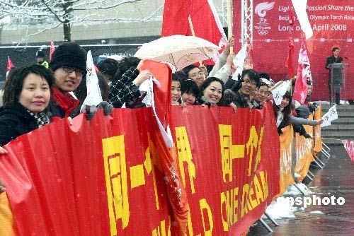 图为中国留学生在温布利体育场外为奥运圣火助威。 沈晨 摄