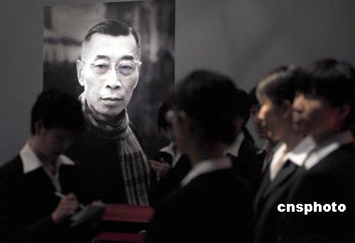 四月七日,“洁白的丰碑:纪念傅雷百年诞辰”展览在北京国家图书馆展览厅开幕,工作人员在傅雷画像前准备开幕式。傅雷先生是中国著名的文学翻译家、艺术评论家和教育家,他是二十世纪中国翻译界的典型代表。该展是迄今规模最大的傅雷纪念展,由中国国家图书馆主办。中新社发 廖攀 摄