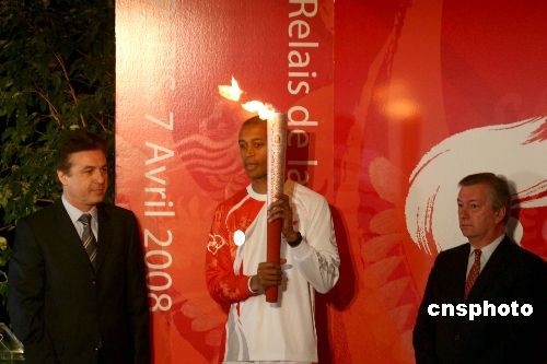当地时间4月7日中午12时35分,北京奥运圣火在“浪漫之都”巴黎传递在巴黎的地标埃菲尔铁塔拉开帷幕。图为第一个火炬手、法国田径运动员史蒂芬·迪亚加纳(中)在现场展示祥云火炬。中新社发 沈晨 摄