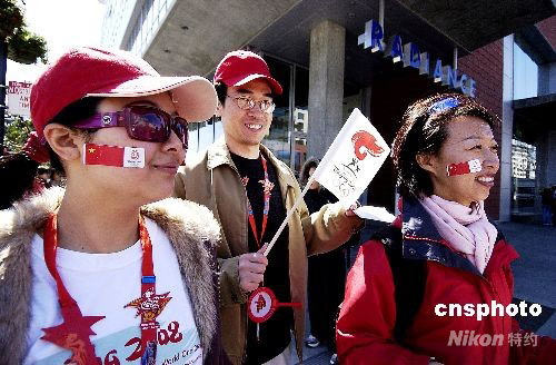当地时间四月九日,北京奥运火炬在美国旧金山传递。两名华人女青年为支持北京奥运,将自制的中国国旗和北京奥运标志贴在脸上参加传递活动。陈钢 摄