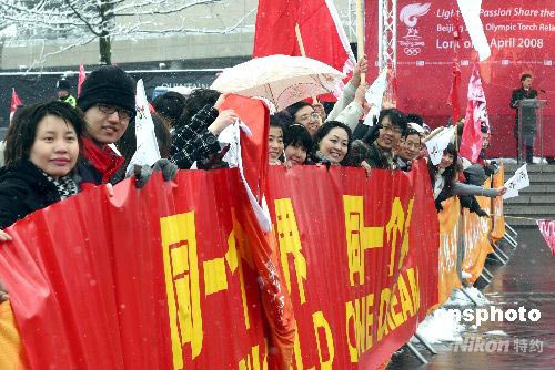 伦敦是北京奥运圣火境外传递过程中,传递路线最长、最复杂的城市。约八个半小时的圣火传递,包括了轮船、自行车、敞篷公共汽车、轻轨等四种特殊传递方式。图为中国留学生在温布利体育场外为奥运圣火助威。 沈晨 摄