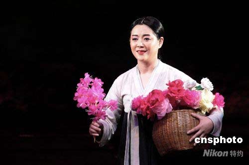 4月15日,朝鲜血海歌舞团歌剧《卖花姑娘》在北京国家大剧院公演,该演出将持续到19日。据悉《卖花姑娘》自1930年推出以来,历经数次加工完善,如今已成为一部朝鲜艺术里程碑似的经典作品,此次在国家大剧院上演的《卖花姑娘》就是上世纪七十年代原汁原味的版本,除了演员有所变动,在结构和音乐上没有任何变化。中新社发 廖攀 摄