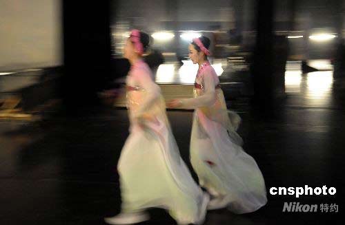 公演前朝鲜女演员奔走在剧院后台精心排练剧目,该演出将持续到19日。中新社发 廖攀 摄