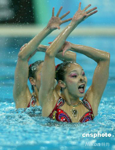 4月16日,“好运北京”花样游泳奥运会资格赛在国家游泳中心拉开战幕。在首日进行的双人技术自选的争夺中,中国姐妹花蒋文文/蒋婷婷发挥出色,以95.500分位居第三。当天两位姐妹花的配乐是哈恰图良的《马刀舞曲》,这是姐妹俩第一次在正式比赛中使用该音乐,这首音乐也将伴随着她们出现在北京奥运会的舞台上。中新社发 富田 摄