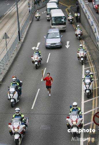 四月十八日,香港举行北京奥运火炬接力测试,以确保五月二日的传递活动顺利举行。图为模拟火炬手通过中环的中银大厦前。中新社发 武仲林 摄