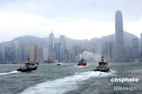 香港举行北京奥运火炬传递路线预演,维港海上数艘警用巡逻艇、快艇、护送火炬传递游轮过海,消防船在维港射水致意、飞机空中盘旋护驾。 王丽南 摄