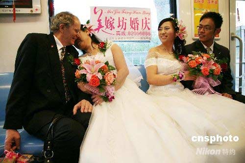 4月19日,新人们准备乘坐南京地铁“婚车专列”。当日,南京举办“幸福长城2008”地铁集体婚礼,12对新人在行进中的南京地铁“婚车专列”上喜结良缘,让其他乘客一道共同感受甜蜜喜庆的气氛,分享他们的幸福时光。中新社发 钟山 摄