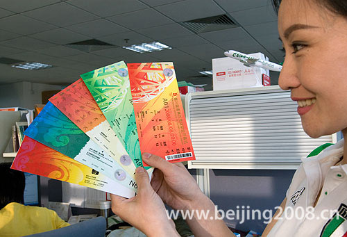 中新网4月23日电 北京时间今天上午,“北京奥运会第三阶段票务销售情况新闻发布会”在北京奥运新闻中心举行。北京奥组委票务中心主任朱炎和北京奥运会奥运艺术中心主任王敏一起揭开了北京奥运会门票的票样。