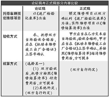 据了解,示范文本正面是需要双方当事人特别约定的事项,背面是在行业内通行适用的一般性条款。在内容设置上,文本既保护了消费者的合法权益,也考虑到了汽修企业的正当利益。