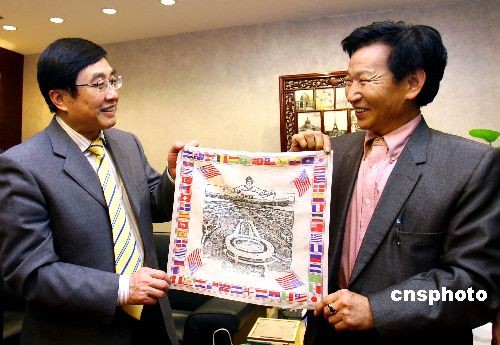 4月29日,美籍华人乔文安(右)在上海向中国2010年上海世博会组织者捐赠具有百年历史的国际博览会丝绸纪念品等“世博会文物”。现场捐赠的文物之一是“1909年美国西雅图市举办的阿拉斯加—尤康—太平洋博览会丝绸纪念品”(如图)。专家鉴定具有百年历史的这一丝绸纪念品上绘有当时象征中国清政府的龙纹旌旗,是中国参与世界性博览会的有力物证。自今年5月起,乔文安捐赠的“世博会文物”将在上海新辟的“世博会常年展示中心”公开展示。中新社发 世博局 摄