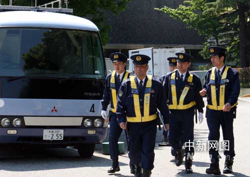 中国国家主席胡锦涛五月六日起,将对日本进行为期五天的国事访问。据当地媒体报道,为了确保胡锦涛访日顺利,日本警方动用了数千名警力。图为警员乘坐大巴车抵达胡锦涛将下榻的酒店。中新社记者 齐彬 摄