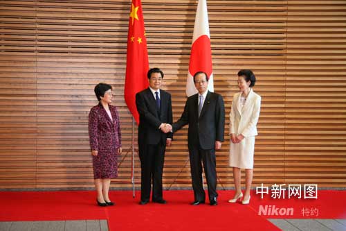 正在日本进行国事访问的中国国家主席胡锦涛,5月7日上午与日本首相福田康夫举行会谈。图为会谈前,福田首相夫妇欢迎胡锦涛与夫人刘永清。中新社记者 齐彬摄