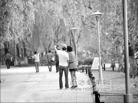 玩自拍,女方很配合地把脸凑到男方脸旁。