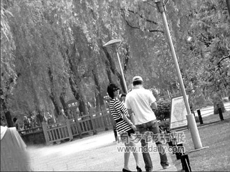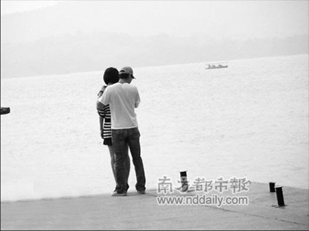 走到沿湖空地,男方很体贴细心地为女方按摩。