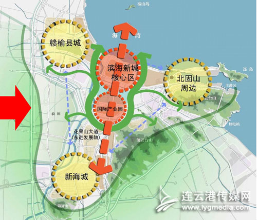 一心三极的内涵是,以连云港新海城区、东部城区、赣榆城区形成相互联动的三大增长极,而位于三极之间的海滨新区是未来最为重要的城市核心。