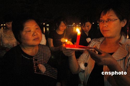 5月19日晚,河南省南阳市卧龙区市民来到白河边放飘自制的河灯,为汶川地震灾民祈福。这些河灯均为心型,上面放上点燃的红蜡烛,寓意一水相连,山脉相通,血脉相亲。