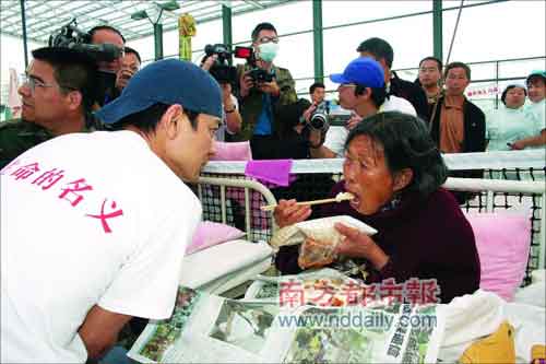 结束了前天的灾区探访后,昨天下午,一众艺人又与刚加入他们的行列的黎明、何韵诗、杨千女华等人前往成都电视台,为当晚举行的《以生命的名义》大型救灾义演节目进行彩排。