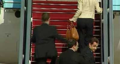 枪响之时,军乐仪队正在表演,宾主显然都未听到枪声。身着暗色劲装的男子迅即掩护萨科齐和妻子登上飞机扶梯。在慌乱中,萨科齐的妻子布吕尼花容失色,抢在丈夫前头登机。