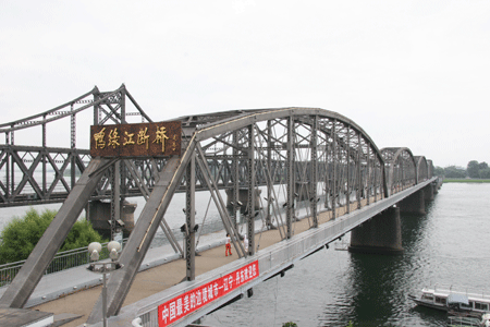 中新网7月2日电 7月1日,2008全国网络媒体辽宁行记者采访团来到那曾经战火纷飞的鸭绿江断桥参观。鸭绿江端桥为鸭绿江上诸多桥中第一座桥,1909年5月动工,1911年10月竣工。由当时日本朝鲜总督府铁道局所建。始为铁路桥,12孔,长944.2米。从中方数第4孔为开闭梁,以4号墩为轴,可旋转90°,便于过往船只航行。