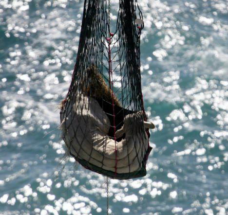 皇家海军直升机将装在网里的公牛运出悬崖,将它送回牛群。