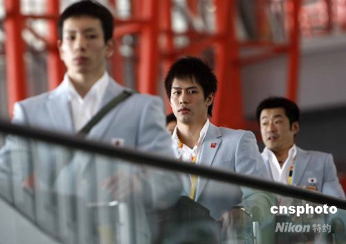 7月31日,日本体操男队抵达北京首都国际机场。日本体操队领军人物福田洋之(中)随队抵达。中新社发 杜洋 摄