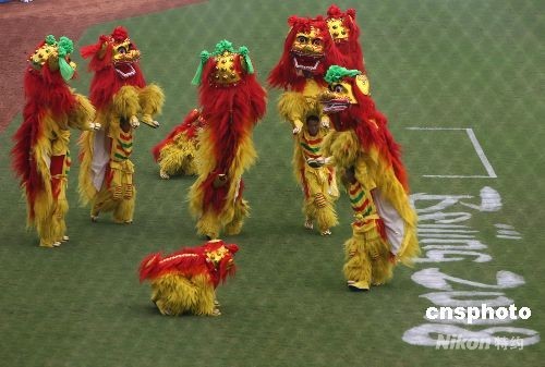 北京奥运会棒球比赛舞狮表演。中新社发 武仲林 摄