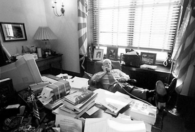 他的办公桌面则活脱脱一间仓库:一个贝利·高华德的摇头公仔,一个泰迪·罗斯福的填充人偶,一个盛满羽毛的杯子,一个帽子上写着“军队”二字的绿色巫婆填充玩偶,一条刻着在伊拉克战死的某士兵名字的手镯,以及数不清的碎纸、石头、硬币和曲别针。粘在桌子一角的签语饼的小纸条很容易勾起人们的回忆,上面写着:“相比于金钱和成功,原则对你更重要。
