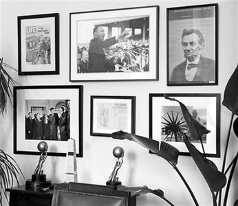 办公室里有一面“英雄墙”,贴的都是他钦佩的历史人物照片,其中有亚伯拉罕·林肯、甘地和他的纺车、马丁·路德·金和约翰·F·肯尼迪。墙上还挂了一份加了外框的1963年华盛顿游行时日程安排的原始文件,金正是在那次游行过程中发表了《我有一个梦想》的演讲。